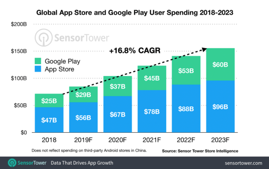 Es gibt mal wieder neue Zahlen, die die Erfolgsgeschichte des AppStore weiter manifestieren. So haben die Marktbeobachter von Sensor Tower ermittelt, das sich die Zuwachsraten in Apples virtuellem Softwarekaufhaus immer rasanter entwickeln. Konkret sollen sich die Ausgaben im AppStore zwischen heute und dem Jahr 2023 mehr als verdoppeln. Gaben die Nutzer im vergangenen Jahr noch 47 Milliarden US-Dollar aus, sollen es in vier Jahren bereits 96 Milliarden sein, was einem Zuwachs von 104% bedeute. Auch dann soll übrigens der AppStore noch deutlich vor dem Google Play Store liegen und für 62% der Ausgaben bei mobilen Apps verantwortlich zeichnen.