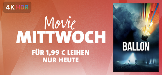 Auch heute hat Apple wieder den sogenannten "Movie Mittwoch" ausgerufen. Dabei wird jeden Mittwoch ein ausgewählter Film aus dem iTunes-Sortiment für 24 Stunden zum Sonderpreis von nur € 1,99 in 4K HDR-Qualität zum Leihen angeboten. Heute erhält man dabei das DDR-Fluchtdrama Ballon von Michael "Bully" Herbig. Nachdem man den Leih-Film geladen hat, kann er innerhalb von 30 Tagen angeschauen werden. Wie immer bei geliehenen Filmen aus dem iTunes Store gilt: Hat man hiermit einmal begonnen, muss man ihn innerhalb von 48 Stunden beenden.