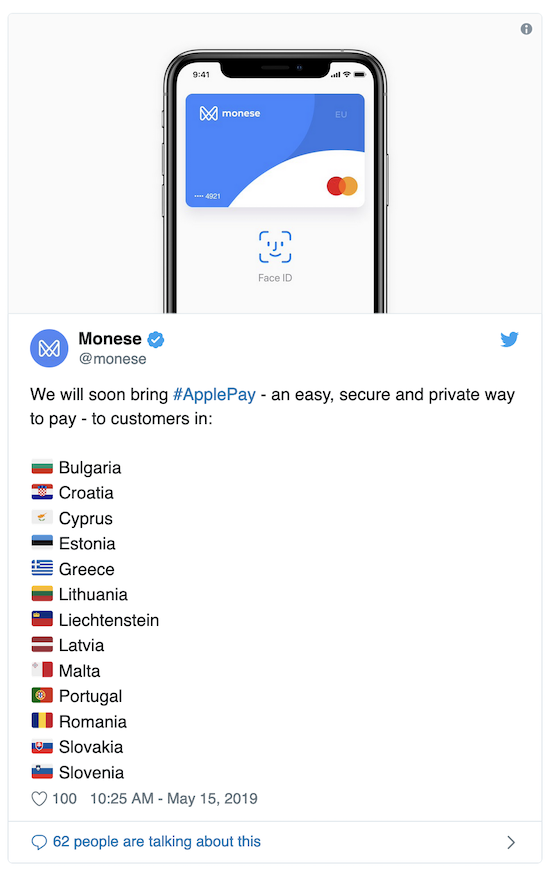 Apple CEO Tim Cook hatte angekündigt, dass sein Unternehmen Apple Pay bis Ende des Jahres in 40 Ländern am Start haben möchte. Dieses Ziel treibt man offenbar hinter den Kulissen deutlich voran. So hat die mobile Bank Monese, über die Apple Pay auch in Deutschland angeboten wird, nun auf Twitter angekündigt, dass man Apples Bezahldienst in Kürze in diversen Ländern anbieten werde, wo Apple Pay momentan noch nicht zur Verfügung steht. Namentlich erwähnt werden dabei Bulgarien, Kroatien, Zypern, Estland, Griechenland, Litauen, Lettland, Liechtenstein, Malta, Portugal, Rumänien, die Slowakei und Slowenien. Bereits seit einiger Zeit bekannt ist, dass Apple Pay in Kürze auch in den Niederlanden, Ungarn und Luxemburg starten wird.