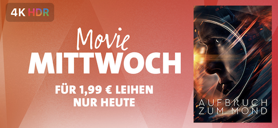 Auch heute hat Apple wieder den sogenannten "Movie Mittwoch" ausgerufen. Dabei wird jeden Mittwoch ein ausgewählter Film aus dem iTunes-Sortiment für 24 Stunden zum Sonderpreis von nur € 1,99 in 4K HDR-Qualität zum Leihen angeboten. Heute erhält man dabei das SciFi-Drama Aufbruch zum Mond mit Ryan Gosling. Nachdem man den Leih-Film geladen hat, kann er innerhalb von 30 Tagen angeschauen werden. Wie immer bei geliehenen Filmen aus dem iTunes Store gilt: Hat man hiermit einmal begonnen, muss man ihn innerhalb von 48 Stunden beenden.