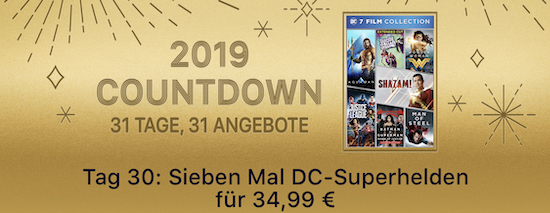 Das Weihnachtsfest liegt inzwischen hinter uns und vor allem für Kinder bedeutete die Zeit bis zum Weihnachtsfest jeden Tag ein bisschen Freude beim Öffnen der Türen des Adventskalenders. Auch Apple bietet in diesem Jahr wieder eine Dezember-Aktion an und weitet diese gar auf 31 Tage, also bis zum Ende des Monats aus. Unter dem Motto "2019 Countdown - 31 Tage, 31 Angebote" wird man dabei jeden Tag mit einem neuen Inhalt aus dem Film-Bereich des iTunes Store zum Sonderpreis beschenkt. Heute erhält man auf diese Weise das DC Superhelden Bundle, bestehend aus sieben Blockbustern aus dem DC-Universum für nur € 34,99 in HD-Qualität zu kaufen.
