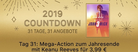 Das Weihnachtsfest liegt inzwischen hinter uns und vor allem für Kinder bedeutete die Zeit bis zum Weihnachtsfest jeden Tag ein bisschen Freude beim Öffnen der Türen des Adventskalenders. Auch Apple bietet in diesem Jahr wieder eine Dezember-Aktion an und weitet diese gar auf 31 Tage, also bis zum Ende des Monats aus. Unter dem Motto "2019 Countdown - 31 Tage, 31 Angebote" wird man dabei jeden Tag mit einem neuen Inhalt aus dem Film-Bereich des iTunes Store zum Sonderpreis beschenkt. Heute erhält man auf diese Weise den Action-Kracher John Wick: Kapitel 3 mit Keanu Reeves für nur € 3,99 in HD-Qualität zu kaufen.