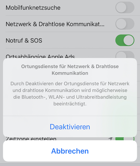 Der Twitter-Nutzer Brandon Butch hatte ihn als erster entdeckt. Er befindet sich in den Einstellungen im Bereich "Datenschutz > Ortungsdienste > Systemdienste" und hört dort auf den Namen "Netzwerk & Drahtlose Kommunikation". Zumindest in meinem Fall war der Schalter standardmäßig deaktiviert. Aktiviert und deaktiviert man ihn anschließend wieder, erscheint die unten zu sehende Meldung, dass hierdurch möglicherweise die Bluetooth-, WLAN- und Ultrabreitbandleistung beeinträchtigt wird.