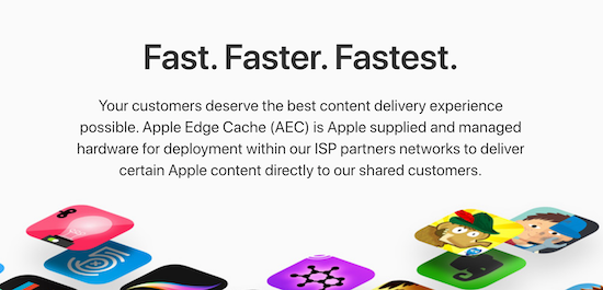 Auf seiner Webseite zum Thema Apple Edge Cache konkretisiert Apple die Anforderungen, die dabei an die jeweiligen Anbieter gestellt werden. Neben dem Vorteil durch die für den Endnutzer höhere Geschwindigkeit kann mit dem Edge Cache auch der Datenverkehr im Internet insgesamt reduziert werden. Entsprechende Ideen gab es in Cupertino gerüchtehalber in der Vergangenheit bereits des Öfteren. Ein gutes Beispiel für die praktische Anwendung ist ein größeres iOS-Update. Wurde dieses bereits von einem anderen Nutzer in der Nähe geladen, wird die Kopie beim Internet Provider vorgehalten und kann für den nächsten Nutzer in diesem Netzsegment direkt von dort ausgeliefert werden, statt von den Apple-Servern in den USA.