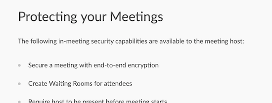 Grundsätzlich ist das Nicht-Vorhandensein der Ende-zu-Ende Verschlüsselung kein allzu großes Problem wenn man bedenkt, dass Gruppenchats über FaceTime nach wie vor die einzige Lösung ist, die dies anbietet. Das Problem ist vielmehr, dass Zoom mit der Ende-zu-Ende Verschlüsselung auf seiner Webseite explizit bewirbt, wie der folgende Screenshot zeigt.