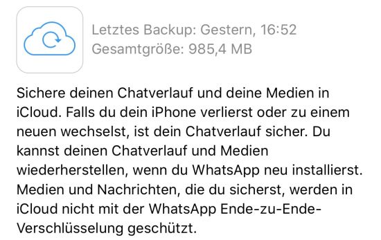 Das neue Backup soll dem Nutzer hingegen die Möglichkeit bieten, es direkt auf dem Gerät zu verschlüsseln und mit einem Passwort zu versehen, ehe es auf iCloud hochgeladen wird. Derzeit befindet man sich bei WhatsApp offenbar noch in einer recht frühen Phase der Umsetzung und testet die Funktion aktuell unter Android und Google Drive als Backup-Ablage. Es darf aber davon ausgegangen werden, dass die Funktion auch für iOS/iCloud angeboten wird.