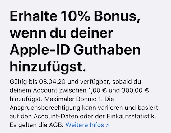 Hinweis: Dies ist derzeit offenbar noch nicht bei allen Nutzern der Fall. Im Zweifel braucht ihr hier also noch ein wenig Geduld. Apple weist darauf hin, dass das Angebot pro Nutzer nur einmal in Anspruch genommen werden kann und bis zu einer Maximalaufladung von € 300,- gilt. Die Aktion läuft noch bis zum 03. April. (mit Dank an alle Tippgeber!)