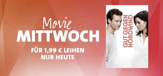 Auch heute hat Apple wieder den sogenannten "Movie Mittwoch" ausgerufen. Dabei wird jeden Mittwoch ein ausgewählter Film aus dem iTunes-Sortiment für 24 Stunden zum Sonderpreis von nur € 1,99 in HD-Qualität zum Leihen angeboten. Heute erhält man dabei das deutsche Drama Gut gegen Nordwind mit Nora Tschirner aus dem vergangenen Jahr. Nachdem man den Leih-Film geladen hat, kann er innerhalb von 30 Tagen angeschaut werden. Wie immer bei geliehenen Filmen aus dem iTunes Store gilt: Hat man hiermit einmal begonnen, muss man ihn innerhalb von 48 Stunden beenden.