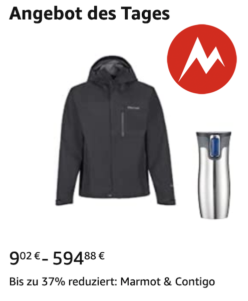 Zugegeben, dieser Hinweis ist für einen Apple-Blog ziemlich ungewöhnlich. Da ich aber nicht nur Apple-Blogger, sondern auch leidenschaftlicher Outdoorer bin, dachte ich mir, ich gebe den Tipp an euch weiter. Vielleicht ist bei euch ja auch der eine oder andere dabei, der durch die Corona-Pandemie die landschaftliche Schönheit Deutschlands, das Wandern oder sonstige Outdoor-Aktivitäten für sich entdeckt hat. Bei Amazon kann man heute in den Tagesangeboten bei diversen Produkten des wirklich empfehlenswerten Outdoor-Ausstatters Marmot sparen. Mit dabei ist alles, was man für draußen so gebrauchen kann. Von Jacken über Regenhosen, Rucksäcke und Isomatten bis hin zu Duffels und Zelten. Ein echter Tipp von mir ist die durch und durch empfehlenswerte Softshell-Jacke ROM, die man aktuell je nach Farbe und Größe schon für unter € 100,- bekommt. Über den folgenden Link gelangt ihr zur Übersicht über alle reduzierte Produkte: Marmot und Contigo im Tagesangebot