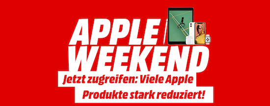 Auch an diesem Sonntag kann man wieder kräftig beim Einkauf von Apple- und Zubehörprodukten in verschiedenen Online-Shops sparen. Nach wie vor und nur noch bis heute läuft in der Online-Dependance des MediaMarkt das "Apple-Weekend". Im Rahmen der Aktion lassen sich verschiedene Apple-Geräte, vom iPhone, über das iPad, verschiedene Macs und Apple Watches bis hin zu den AirPods zum Teil deutlich reduziert erwerben. Das Highlight unter den Angeboten dürften die AirPods Pro sein, die beim MediaMarkt kurzfristig lieferbar und sogar gegenüber dem offiziellen Apple-Preis um € 30,- reduziert sind. Der folgende Link führt direkt zur Landingpage der Aktion: Apple-Weekend bei MediaMarkt