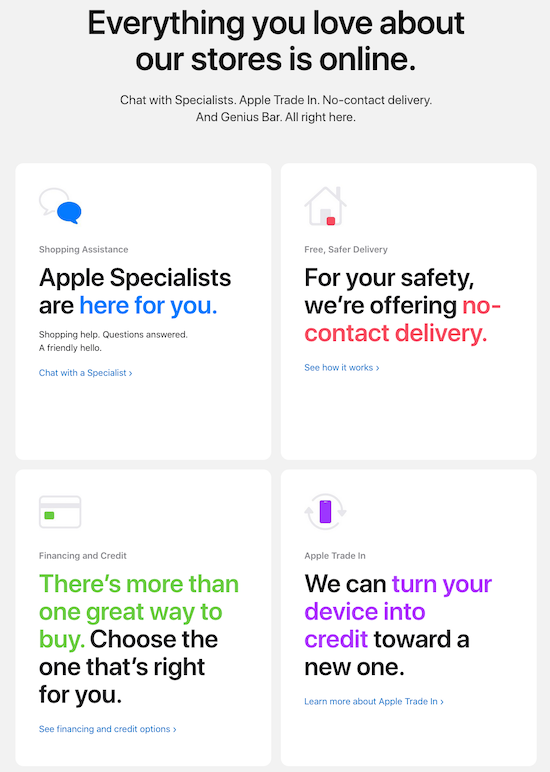 Auf einzelnen Kacheln werden Besucher der Seite zu den verschiedenen Themen geleitet, wie beispielsweise zur Apple Card, zu den Trade-In Option zu den nun virtuell stattfindenden "Today at Apple" Sessions oder auch zu den verschiedenen Möglichkeiten, Support zu erhalten.