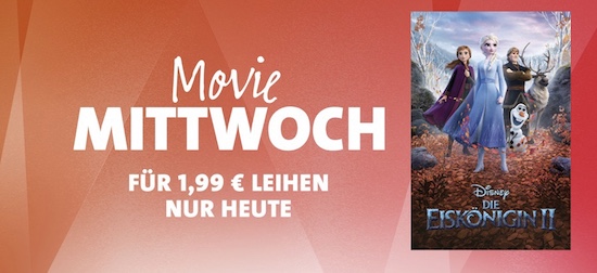 Auch heute hat Apple wieder den sogenannten "Movie Mittwoch" ausgerufen. Dabei wird jeden Mittwoch ein ausgewählter Film aus dem iTunes-Sortiment für 24 Stunden zum Sonderpreis von nur € 1,99 in HD-Qualität zum Leihen angeboten. Heute erhält man dabei den Disney-Animationsfm Die Eiskönigin 2 aus dem vergangenen Jahr. Nachdem man den Leih-Film geladen hat, kann er innerhalb von 30 Tagen angeschaut werden. Wie immer bei geliehenen Filmen aus dem iTunes Store gilt: Hat man hiermit einmal begonnen, muss man ihn innerhalb von 48 Stunden beenden.