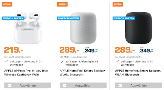 Highlight dürften die AirPods Pro sein, die bei Saturn kurzfristig lieferbar und sogar für nur € 219,- zu haben sind. Der folgende Link führt direkt zur Landingpage der Aktion: Apple Days bei Saturn