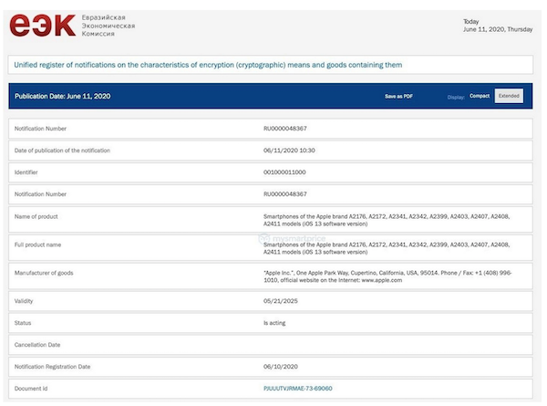 Kurz vor Beginn der diesjährigen WWDC hat Apple mal wieder in der Datenbank der Eurasischen Wirtschaftskommission diverse neue und bislang unveröffentlichte Produkte registriert. Wie die Kollegen von MySmartPrice berichten, befinden sich darunter unter anderem neun unbekannte iPhone-Modelle mit den Bezeichnungen A2176, A2172, A2341, A2342, A2399, A2403, A2407, A2408, und A2411. Letzte Gerüchte sehen für dieses Jahr vier neue Modelle, die erneut im Herbst erscheinen sollen. Dabei soll es sich um ein 5,4"-Modell, zwei 6,1"-Modelle und ein 6,7"-Modell handeln. Alle neuen iPhones sollen dabei über OLED-Displays verfügen. Die Kollegen von MacRumors spekulieren, dass es sich bei den Modellen A2176 und A2172 um die beiden Low-End Modelle umd bei den anderen um die Pro-Modelle in verschiedenen Ausführungen handeln könnte.