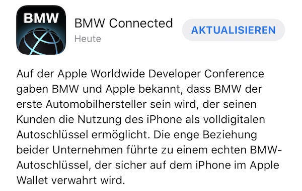 Zwar hat Apple das benötigte iOS-Update bislang noch nicht freigegeben, der deutsche Autobauer BMW legt jedoch am heutigen Abend mit einem Update seiner Connected-App bereits vor und macht sie mit CarKey kompatibel. Das benötigte iOS-Update auf Version 13.6 dürfte also in Kürze folgen. BMW war einer der ersten Autohersteller, der die Unterstützung von CarKey angekündigt hatte. Die Funktion steht auf Wunsch in allen neuen BMW-Modellen zur Verfügung, die nach dem 01. Juli 2020 gefertigt wurden.