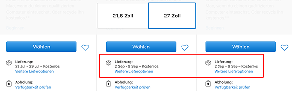 Okay, nach der WWDC-Ankündigung, dass Apple seine Macs schrittweise von Intel- auf eigene Prozessoren umstellen wird war eigentlich klar, dass es in den kommenden Monaten bei jeder sich anbahnenden Mac-Aktualisierung Diskussionen darüber geben wird, mit was für einem Chip dieser ausgestattet sein wird. So ist dies bereits jetzt zu beobachten. Aktuell verschlechtern sich nämlich die Lieferzeiten für den 27" iMac, dessen zwei höherwertige Standard-Modelle derzeit erst im September ausgeliefert werden sollen. In normalen Zeiten ist dies ein recht guter Hinweis darauf, dass Apple langsam aber sicher die Lagerbestände auflöst, um ein neues Modell zu lancieren.