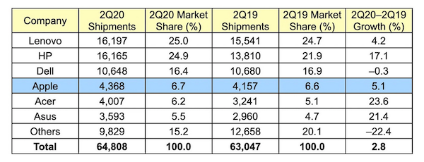 Bereits in den vergangenen Wochen ist immer mal wieder deutlich geworden, dass Apple bislang vergleichsweise gut durch die Corona-Krise gekommen ist. Dies zeigt sich nun erneut an aktuellen Zahlen die die Analysten von Gartner über das zweite Quartal des Jahres ermittelt haben. Demnach konnten Apples Mac-Ansätze in diesem Zeitraum um 5,1% im Jahresvergleich zulegen. Insgesamt sollen 4,4 Millionen Macs den Besitzer gewechselt haben. Im Vorjahresquartal waren es noch 4,2 Millionen. Hierdurch konnte Apple auch den Marktanteil minimal von 6,6% auf 6,7% steigern und liegt damit weiter auf dem vierten Platz aller Hersteller hinter Lenovo, HP und Dell. Mit seinem Wachstum lag Apple dann auch über dem des gesamten PC-Markts, der im zweiten Quartal um 2,8% zulegen konnte.