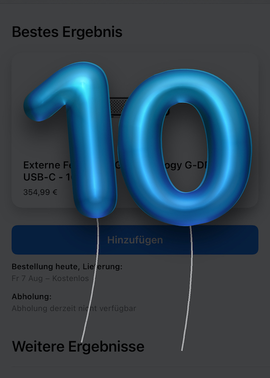 An und für sich ist Apple eher nicht für großartige Sentimentalitäten bekannt. Hin und wieder bricht die Freude über einen erreichten Meilenstein oder ein Jubiläum dann aber doch mal durch. So auch aktuell in der Apple Store App. Diese erblickte vor exakt 10 Jahren das Licht der Welt - Grund genug für Apple, dies mit einem kleinen Easter Egg zu feiern. Tippt man in die Suchzeile "10 years" ein, steigen vom unteren Displayrand zwei blaue Ballons auf, die den 10. Geburtstag signalisieren. Tut man nichts, tanzen die Ballone eine zeitlang herum, ehe sie von selbst wieder verschwinden. Alternativ kann man sie auch durch Antippen zum Platzen bringen. Probiert's mal aus.