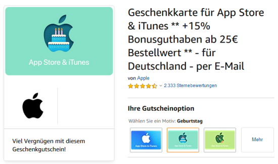 Die neue Woche beginnt mit guten Nachrichten für alle Schnäppchenjäger: Es gibt wieder vergünstigte iTunes-Geschenkkarten. So ist es aktuell der Onlinehändler Amazon, der die Karten mit einem Zusatzguthaben in Höhe von 15% auf den regulären Kartenwert anbietet. Dies gilt pauschal für alle Karten im Wert von € 25,-, € 50,- und € 100,-. Aber Achtung: Die Aktion gilt nur bis Montag, den 12. Oktober 2020, bzw. solange der Vorrat reicht. Die Anzahl der Karten pro Kauf ist anscheinend nicht begrenzt. Man sollte also im Zweifel schnell sein, um noch rechtzeitig zuschlagen zu können. Schließlich haben die Karten ja kein Verfallsdatum. Der aufgedruckte Wert der Karten und das Zusatz-Guthaben können sowohl für Musik, als auch für Fernsehserien, Filme und Einkäufe im Mac- und iOS-AppStore genutzt werden.