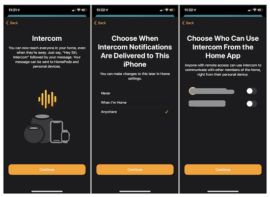 Auf mobilen Geräten erscheint die Intercom-Nachricht als Push Notification mit der Möglichkeit, direkt die empfangene Audiodatei abzuspielen. Dabei kann der Nutzer auch entscheiden, wann er die Nachrichten empfangen möchte (Nie / Wenn ich zu Hause bin / Überall). Innerhalb der Home-App wird festgelegt, welche Personen die Intercom-Funktion nutzen dürfen. Über eine Bedienungshilfe können empfangene Sprachnachrichten sogar auf den mobilen Geräten transkribiert angezeigt werden.
