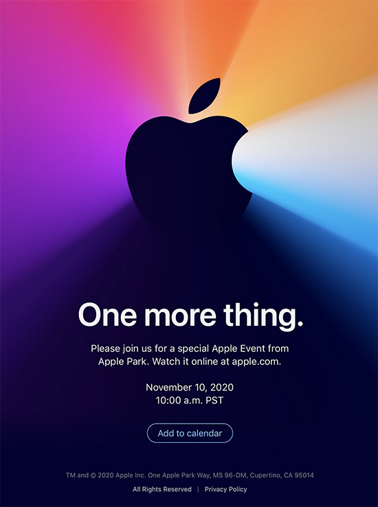 Es kommt also tatsächlich das dritte Apple-Event in diesem Herbst. Eine Woche vor dem bislang spekulierten Termin am 17. November lädt Apple nun zu einem weiteren virtuellen Event am 10. November am Apple Park in Cupertino ein. Dabei dürfte es wenig überraschend um die ersten verfügbaren Macs mit den selbst designten Prozessoren unter dem Namen "Apple Silicon" gehen. Apple stellt das Event unter das gute, alte Steve-Jobs-Motto "One more thing." und wird mit dem Livestream um 19:00 Uhr unserer Zeit starten. Neben den ersten Macs mit Apple Silicon befinden sich mit den AirPods Studio und den AirTags weitere Kandidaten in der Produkt-Pipeline, die auf dem Event präsentiert werden könnten.