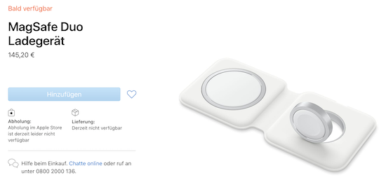 Bereits heute Morgen hatte ich über Hinweise berichtet, wonach Apples MagSafe Duo-Ladegerät und auch die MagSafe-Lederhüllen für die verschiedenen iPhone 12 Modelle möglicherweise erst im kommenden Jahr erscheinen könnten. So sprach Apple in einer Pressemitteilung zum Vorbestellstart von iPhone 12 mini und iPhone 12 Pro Max davon, "die Lederhüllen und das MagSafe Duo-Ladegerät werden zu einem späteren Zeitpunkt erhältlich sein". Immerhin findet man die beiden Zubehörprodukte inzwischen auch im Apple Online Store, jeweils zum Preis von € 145,20. Auch dort gibt es momentan allerdings keinen Hinweis darauf, dass das Zubehör kurzfristig auch erhältlich sein wird. So nennt Apple auch dort weiterhin keinen Termin, sondern schreibt lediglich "Bald verfügbar":