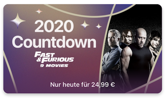 Das Weihnachtsfest liegt inzwischen hinter uns und vor allem für Kinder bedeutete die Zeit bis dahin im Dezember jeden Tag ein bisschen Freude beim Öffnen der Türen des Adventskalenders. Auch Apple bietet in diesem Jahr wieder eine Dezember-Aktion an und weitet diese gar auf 31 Tage, also bis zum Ende des Monats aus. Unter dem Motto "2020 Countdown" wird man dabei jeden Tag mit einem neuen Inhalt aus dem Film-Bereich des iTunes Store zum Sonderpreis beschenkt. Heute erhält man auf diese Weise das aus allen neun Teilen der Reihe bestehende Fast & Furious Bundle für nur € 24,99 zu kaufen.