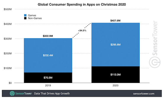 Die Corona-Krise schlägt sich auch im AppStore nieder. Wie die Analysten von Sensor Tower ermittelt haben, war nämlich 2020 ein absolutes Rekordjahr in Sachen weltweite Ausgaben im Apple AppStore und im Google Play Store. Gemeinsam überschritten beide Stores in diesem Jahr die Markt von 100 Milliarden US-Dollar - und das bereits im November. Über Weihnachten dürfte die Zahl noch einmal deutlich angewachsen sein. Hier erwarten die Analyten noch einmal 407,6 Millionen Dollar in beiden Stores zusammen, was einem Wachstum von 34,5% im Jahresvergleich des Weihnachtsgeschäfts bedeuten würde. Letztes Jahr hatten die Analysten Ausgaben von 303 Millionen Dollar an Weihnachten ermittelt. Erneut waren vor allem die Spiele der große Umsatztreiber im AppStore.