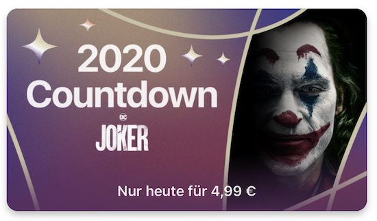 Das Weihnachtsfest liegt inzwischen hinter uns und vor allem für Kinder bedeutete die Zeit bis dahin im Dezember jeden Tag ein bisschen Freude beim Öffnen der Türen des Adventskalenders. Auch Apple bietet in diesem Jahr wieder eine Dezember-Aktion an und weitet diese gar auf 31 Tage, also bis zum Ende des Monats aus. Unter dem Motto "2020 Countdown" wird man dabei jeden Tag mit einem neuen Inhalt aus dem Film-Bereich des iTunes Store zum Sonderpreis beschenkt. Heute erhält man auf diese Weise den oscarprämierten Blockbuster Joker über die Entstehungg des Batman-Bösewichts für nur € 4,99 zu kaufen.