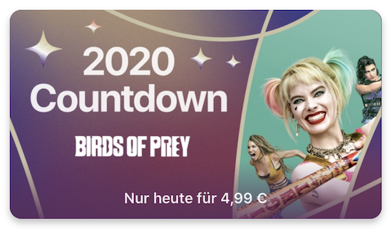 Das Weihnachtsfest rückt mal wieder näher und während sich bei manchen Freude und Besinnlichkeit breit macht, kommt bei anderen eher Hektik beim Weihnachtsshopping auf. Vor allem für Kinder bedeutet die Zeit bis zum Weihnachtsfest jeden Tag ein bisschen Freude beim Öffnen der Türen des Adventskalenders. Auch Apple bietet in diesem Jahr wieder eine Dezember-Aktion an und weitet diese gar auf 31 Tage, also bis zum Ende des Monats aus. Unter dem Motto "2020 Countdown" wird man dabei jeden Tag mit einem neuen Inhalt aus dem Film-Bereich des iTunes Store zum Sonderpreis beschenkt. Heute erhält man auf diese Weise den DC-Blockbuster Birds of Prey mit Margot Robbie für nur € 4,99 zu kaufen.