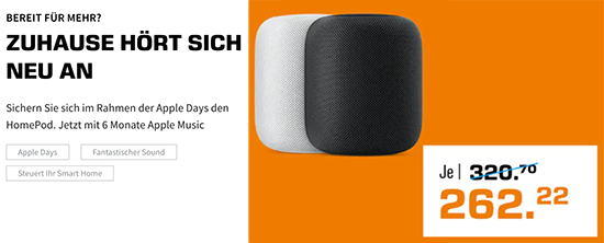 Highlight dürfte dieses Mal der HomePod sein, die bei Saturn kurzfristig lieferbar und sogar für nur € 262,22 zu haben ist. Der folgende Link führt direkt zur Landingpage der Aktion: Apple Days bei Saturn