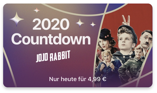 Das Weihnachtsfest rückt mal wieder näher und während sich bei manchen Freude und Besinnlichkeit breit macht, kommt bei anderen eher Hektik beim Weihnachtsshopping auf. Vor allem für Kinder bedeutet die Zeit bis zum Weihnachtsfest jeden Tag ein bisschen Freude beim Öffnen der Türen des Adventskalenders. Auch Apple bietet in diesem Jahr wieder eine Dezember-Aktion an und weitet diese gar auf 31 Tage, also bis zum Ende des Monats aus. Unter dem Motto "2020 Countdown" wird man dabei jeden Tag mit einem neuen Inhalt aus dem Film-Bereich des iTunes Store zum Sonderpreis beschenkt. Heute erhält man auf diese Weise die oscarprämierte Satire Jojo Rabbit mit Scarlett Johansson für nur € 4,99 zu kaufen.