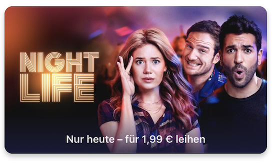 Auch heute hat Apple wieder den sogenannten "Movie Mittwoch" ausgerufen. Dabei wird jeden Mittwoch ein ausgewählter Film aus dem iTunes-Sortiment für 24 Stunden zum Sonderpreis von nur € 1,99 in HD-Qualität zum Leihen angeboten. In dieser Woche handelt es sich um den deutschen Kinofilm Night Life mit Elyas M'Barek den man zum Sonderpreis von € 1,99 erhält. Nachdem man den Leih-Film geladen hat, kann er innerhalb von 30 Tagen angeschaut werden. Wie immer bei geliehenen Filmen aus dem iTunes Store gilt: Hat man hiermit einmal begonnen, muss man ihn innerhalb von 48 Stunden beenden.
