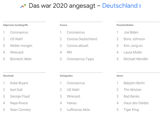 Wie jedes Jahr, hat Google auch in diesem Dezember wieder einen Jahresrückblick auf die am häufigsten gestellten Suchanfragen über die weltgrößte Suchmaschine veröffentlicht. Dieser lässt sich nach Ländern sortiert durchstöbern und liefert noch einmal einen beeindruckenden Rückblick auf die vergangenen 12 Monate. Die meisten Anfragen in Deutschland befassten sich in diesem Jahr wenig überraschend mit Coronavirus, unter anderem gefolgt von der US-Wahl, dem Wirecard-Skandal und der Biontech Aktie. Neben der allgemeinen Liste findet man auf den oben verlinkten Google-Webseiten auch themenbezogene Ranglisten, wie beispielsweise zu Persönlichkeiten, Filmen oder Politik.