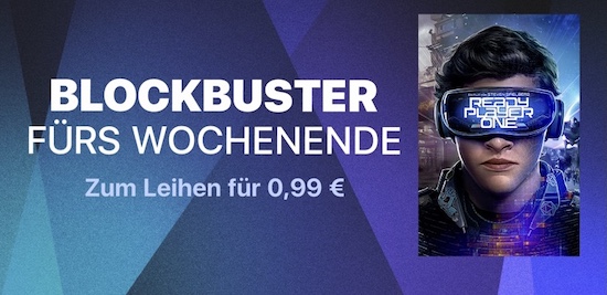 Apple hat zusätzlich zu seinem bereits liebgewonnenen "Movie Mittwoch" nun auch den "Blockbuster fürs Wochenende" ins Leben gerufen. Dabei wird jedes Wochenende ein ausgewählter Film aus dem iTunes-Sortiment für 24 Stunden zum Sonderpreis von nur € 0,99 in HD-Qualität zum Leihen angeboten. In dieser Woche handelt es sich um den Fantasy-Kracher Ready Player One von Steven Spielberg den man zum Sonderpreis von € 0,99 erhält. Nachdem man den Leih-Film geladen hat, kann er innerhalb von 30 Tagen angeschaut werden. Wie immer bei geliehenen Filmen aus dem iTunes Store gilt: Hat man hiermit einmal begonnen, muss man ihn innerhalb von 48 Stunden beenden.