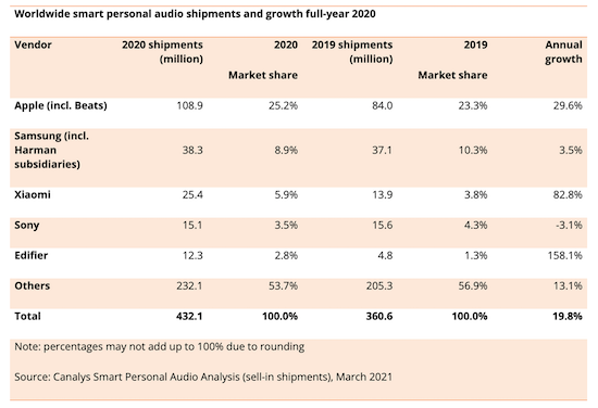 Dass Apple die Kategorie der sogenannten Wearables auch zuletzt weiter dominiert hat, haben bereits Zahlen verschiedener Analysten belegt. In diese Kategorie fallen neben Smartwatches vor allem auch die sogenannten "Smart Personal Audio Devices", zu denen die Analysten von Canalys nun noch einmal eine separate Statistik vorlegen. Demnach konnte Apple im zurückliegenden Jahr von seinen verschiedenen AirPods- und Beats-Modellen satte 108,9 Millionen Stück an den Mann bringen. Dies entspricht einem Zugewinn von knapp 30% gegenüber den 84 Millionen Stück, die man noch im Jahr 2019 verkaufte. Damit liegt Apple auch in diesem Markt mit einem Anteil von 25,2% deutlich vor der Konkurrenz von Samsung (8,9%), Xiaomi (5,9%) und Sony (3,9%). Vor allem das vierte Quartal hat zu Apples Erfolg beigetragen. Allein in diesem Zeitraum konnte das Unternehmen 37,3 Millionen Geräte verkaufen und damit einen Marktanteil von 26,5% auf sich vereinen.