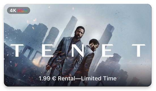 Auch heute hat Apple wieder den sogenannten "Movie Mittwoch" ausgerufen. Dabei wird jeden Mittwoch ein ausgewählter Film aus dem iTunes-Sortiment für 24 Stunden zum Sonderpreis von nur € 1,99 in HD-Qualität zum Leihen angeboten. In dieser Woche handelt es sich dabei um das abgefahrene Action-Spektakel Tenet, das man zum Sonderpreis von € 1,99 erhält. Nachdem man den Leih-Film geladen hat, kann er innerhalb von 30 Tagen angeschaut werden. Wie immer bei geliehenen Filmen aus dem iTunes Store gilt: Hat man hiermit einmal begonnen, muss man ihn innerhalb von 48 Stunden beenden.