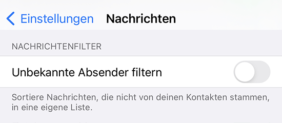 Darüber hinaus hat man die Möglichkeit, in den "Einstellungen" unter "Nachrichten" die Option "Unbekannte Absender filtern" zu aktivieren, die allerdings nur bei iMessage-Nachrichten greift. Erhält man bei aktivierter Funktion eine Nachricht von einem unbekannten Absender, wird diese in eine eigene Liste ausgelagert und ist so leichter zu erkennen.