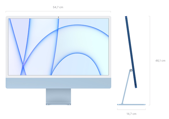 Im Inneren kommt erwartungsgemäß ein Apple Silicon M1-Prozessor zum Einsatz, der das neue ultraschlanke Design überhaupt erst ermöglicht hat. Der neue iMac ist nur noch sensationelle 11,5 Millimeter dick. Dank des M1-Chips ist es nun auch erstmals auf dem iMac möglich, iOS bzw. iPadOS Apps auszuführen. Das Display wächst auf ein 24" 4,5K Retina Display mit 11,3 Millionen Pixeln, 500 Nits Helligkeit und über einer Milliarde Farben. Der neue iMac verfügt außerdem über eine 1080p FaceTime HD Kamera, Mikrofone in Studioqualität und ein Soundsystem mit sechs Lautsprechern.
