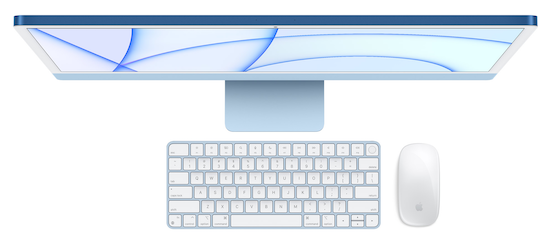 Dank neuem Zubehörs in den passenden Farben zum neuen iMac steht am Desktop auch erstmals Touch ID zur Verfügung. Auch eine neue Magic Mouse und das Magic Trackpad gibt es in neuen Farben, passend zum jeweiligen iMac. Beim Rechner selbst sind die farben auf der Vorderseite sanfter, auf der Rückseite kräftiger gestaltet. Die komplette Vorderseite ist zudem mit Glas bedeckt und die Displayränder abermals schmaler als noch beim Vorgänger. Auf der Vorderseite kommt eine neue 1080p FaceTime HD Kamera zum Einsatz, die gestochen scharfe Bilder für Selfies und die Videotelefonie ermöglicht.