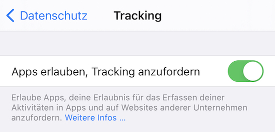 Darüber hinaus findet sich in den Einstellungen des Geräts bereits seit geraumer Zeit ein Schalter unter "Datenschutz > Tracking", mit dem man das Tracking generell deaktivieren kann. Ist dies geschehen, fragen auch die Apps gar nicht mehr hiernach. Ist der Schalter hingegen aktiviert, findet man an dieser Stelle auch Einstellungen für die Apps, die bereits die ATT implementiert haben und kann deren Einstellungen auch im Nachgang noch verändern.