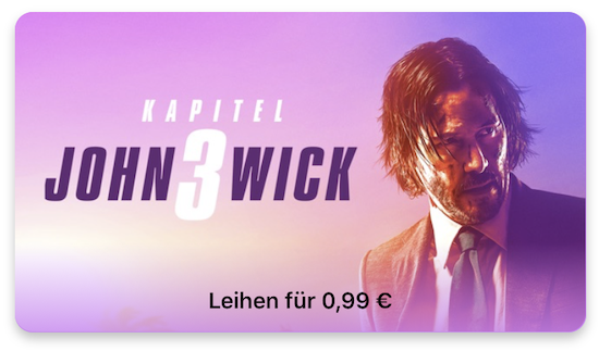 Apple hat zusätzlich zu seinem bereits liebgewonnenen "Movie Mittwoch" nun auch den "Blockbuster fürs Wochenende" ins Leben gerufen. Dabei wird jedes Wochenende ein ausgewählter Film aus dem iTunes-Sortiment für 24 Stunden zum Sonderpreis von nur € 0,99 in HD-Qualität zum Leihen angeboten. In dieser Woche handelt es sich um den Action-Reißer John Wick: Kapitel 3 mit Keanu Reves, den man zum Sonderpreis von € 0,99 erhält. Nachdem man den Leih-Film geladen hat, kann er innerhalb von 30 Tagen angeschaut werden. Wie immer bei geliehenen Filmen aus dem iTunes Store gilt: Hat man hiermit einmal begonnen, muss man ihn innerhalb von 48 Stunden beenden.