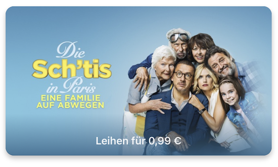 Der Gang ins Kino muss leider für die kommenden paar Wochen wegen der Corona-Pandemie noch ausfallen. Aus diesem Grund hat sich die Filmbranche mit verschiedenen Streaminganbietern zusammengeschlossen, um in dieser Woche die "Mega Movie Week" zu veranstalten. Dabei werden aktuelle Blockbuster auf den teilnehmenden Plattformen teils stark vergünstigt zum Kaufen angeboten. Unter anderem nehmen auch Apple TV und Amazon Prime Video an der Aktion teil. Zudem bietet Apple auch aktuell wieder seinen "Blockbuster fürs Wochenende" an. In dieser Woche handelt es sich um die französische Komödie Die Sch'tis in Paris, die man zum Sonderpreis von € 0,99 erhält. Nachdem man den Leih-Film geladen hat, kann er innerhalb von 30 Tagen angeschaut werden. Wie immer bei geliehenen Filmen aus dem iTunes Store gilt: Hat man hiermit einmal begonnen, muss man ihn innerhalb von 48 Stunden beenden.
