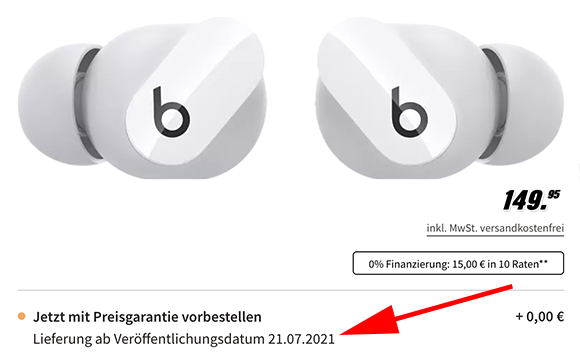 Während die Beats Studio Buds in den USA bereits seit dem 24. Juni ausgeliefert werden, könnte der Verkaufsstart hierzulande am 21. Juli erfolgen. Zwar stellt Apple auf den eigenen Beats-Webseiten nach wie vor lediglich eine Benachrichtigungsmöglichkeit zur Verfügung, beispielsweise beim MediaMarkt werden sie allerdings mit dem Hinweis gelistet: "Lieferung ab Veröffentlichungsdatum 21.07.2021". Dort können sie über den folgenden Link entsprechend auch bereits mit Preisgarantie für € 149,- über die folgenden Links vorbestellt werden: