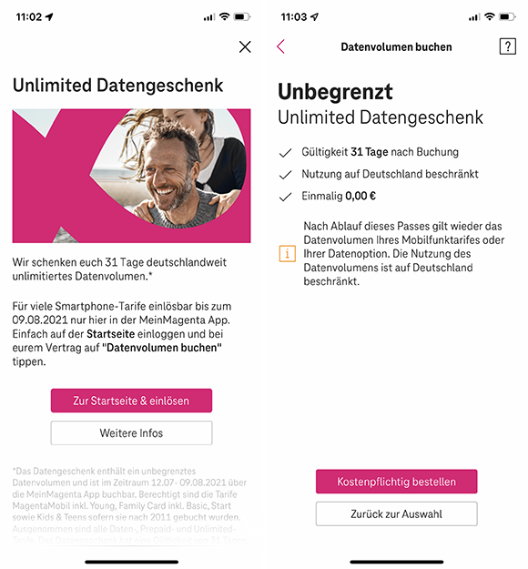 Um das Geschenk in Anspruch nehmen zu können, reicht es aus, die MeinMagenta-App (kostenlos im AppStore) zu öffnen und direkt auf dem Startbildschirm den entsprechenden Button zu betätigen. Alternativ kann man dies auch auf der Webseite https://pass.telekom.de tun. Achtet jedoch bitte auf die Bedingungen der Aktion. So muss der Mobilfunkvertrag beispielsweise aus dem Jahr 2011 oder neuer sein. Zudem sind die Tarife SmartConnect, MagentaMobil Speedbox, MagentaMobil XL, CarConnect sowie Prepaid-Tarife und reine Datentarife von der Aktion ausgenommen.