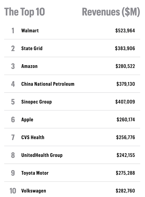Gemäß der Rangliste lag Apples Umsatz bei 274,515 Milliarden US-Dollar, wovon 57,411 Milliarden als Gewinn übrig blieben. Dies bedeutet jeweils einen leichten Anstieg von 260,174 Milliarden bzw. 55,256 Milliarden Dollar im vergangenen Jahr. Damit ist Apple nun das profitabelste Unternehmen der Welt und hält sich seit 2013 in den Top 20 der Fortune Global 500.
