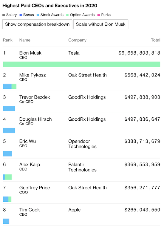 Demnach erhielt Cook im vergangenen Jahr 265 Millionen Dollar, die sich vor allem aus Boni und aus Aktienoptionen seines Unternehmens zusammensetzten. In 2019 war er hingegen noch der am zweitbesten bezahlte CEO in den USA und musste sich lediglich Tesla CEO Elon Musk geschlagen geben. Während Musk auch in 2020 seine Spitzenposition mit einem satten Einkommen von 6,6 Milliarden US-Dollar (!) verteidigen konnte, wurde Cook im vergangenen Jahr von Mike Pykosz (CEO von Oak Street Health), Trevor Bezdek und Douglas Hirsch (Co-CEOs von GoodRX Holdings), Eric Wu (CEO von Opendoor Technologies), Alex Karp (CEO von Palantir Technologies) und Geoffrey Price (COO von Oak Street Health) überholt.