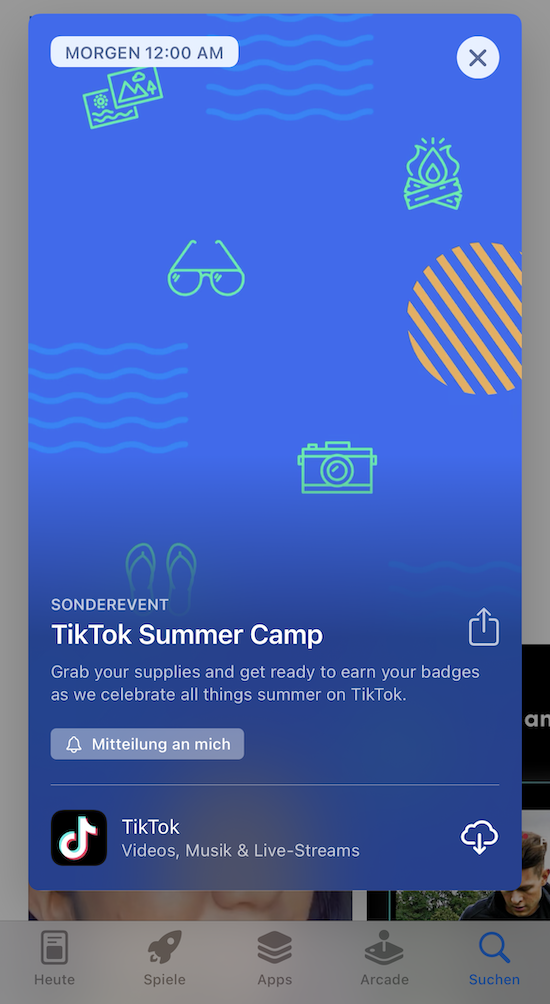 So berichten die Kollegen von 9to5Mac vom sogenannten "TikTok Summer Camp", welches gestern stattgefunden hat. Auf dem Heute-Tab wird das Event auf einer eigenen Kachel mit einem Zeitpunkt wann das Event stattfindet und einer Downloadmöglichkeit der TikTik-App präsentiert. Tippt man die Kachel an, erhält man weitere Informationen zu der virtuellen In-App-Veranstaltung. Genau so hatte Apple die neue Funktion auch auf der WWDC Anfang Juni vorgestellt, nämlich als Möglichkeit, Nutzer auf Dinge wie Spieleturniere, Filmpremieren, Konzertstreams, etc. hinzuweisen. Vielleicht fehlt mir im Moment dafür ein passender Anwendungsfall. Ich lasse mich nach dem allgemeinen Start von iOS 15 gerne vom Gegenteil überzeugen, wenn die Anzahl der AppStore Events sicherlich zunehmen wird.