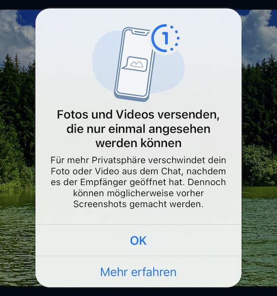 Aus diesem Grund führen wir heute Fotos und Videos als Einmalansicht ein. Diese verschwinden aus dem Chat, wenn sie einmal geöffnet wurden. So haben Benutzer noch mehr Kontrolle über ihre Privatsphäre.