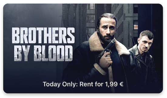 Auch heute hat Apple wieder den sogenannten "Movie Mittwoch" ausgerufen. Dabei wird jeden Mittwoch ein ausgewählter Film aus dem iTunes-Sortiment für 24 Stunden zum Sonderpreis von nur € 1,99 in HD-Qualität zum Leihen angeboten. In dieser Woche handelt es sich dabei um den Thriller Brothers by Blood, den man zum Sonderpreis von € 1,99 erhält. Nachdem man den Leih-Film geladen hat, kann er innerhalb von 30 Tagen angeschaut werden. Wie immer bei geliehenen Filmen aus dem iTunes Store gilt: Hat man hiermit einmal begonnen, muss man ihn innerhalb von 48 Stunden beenden.